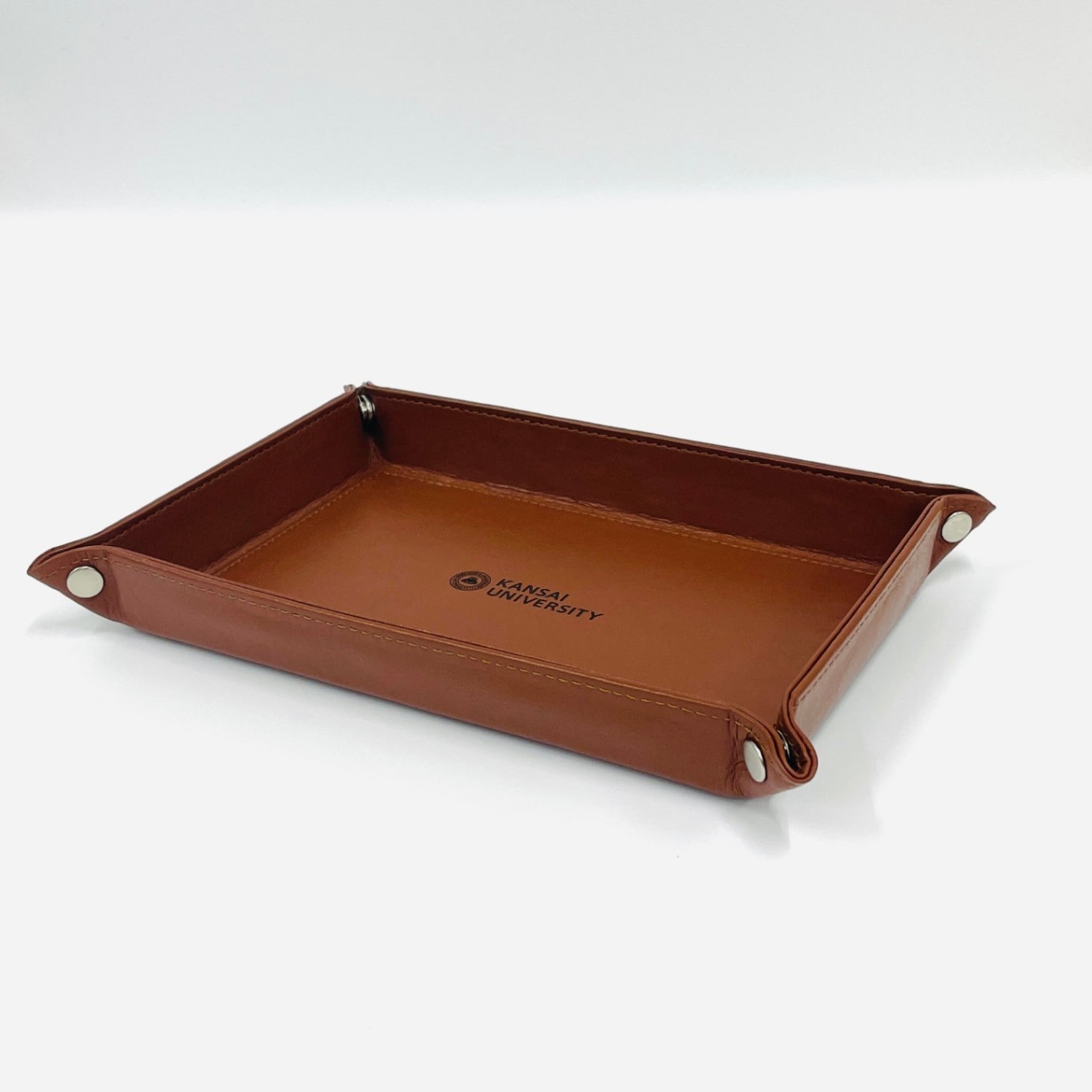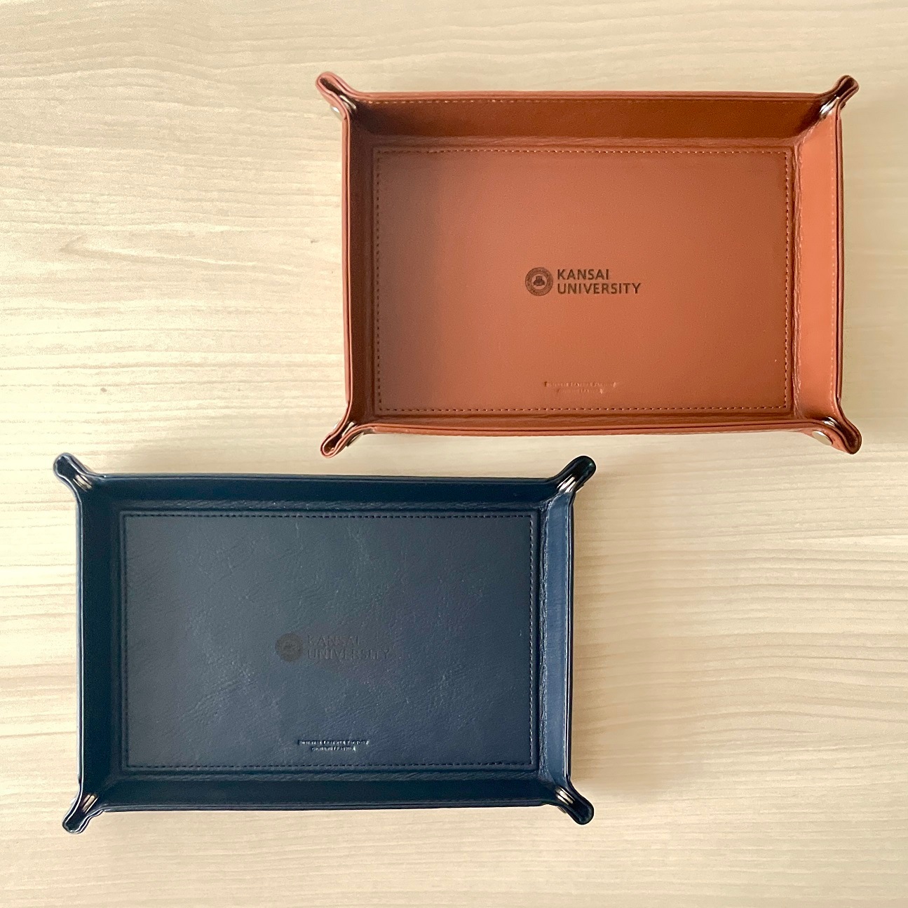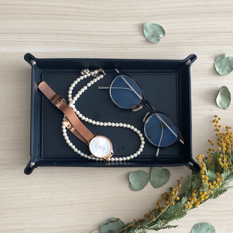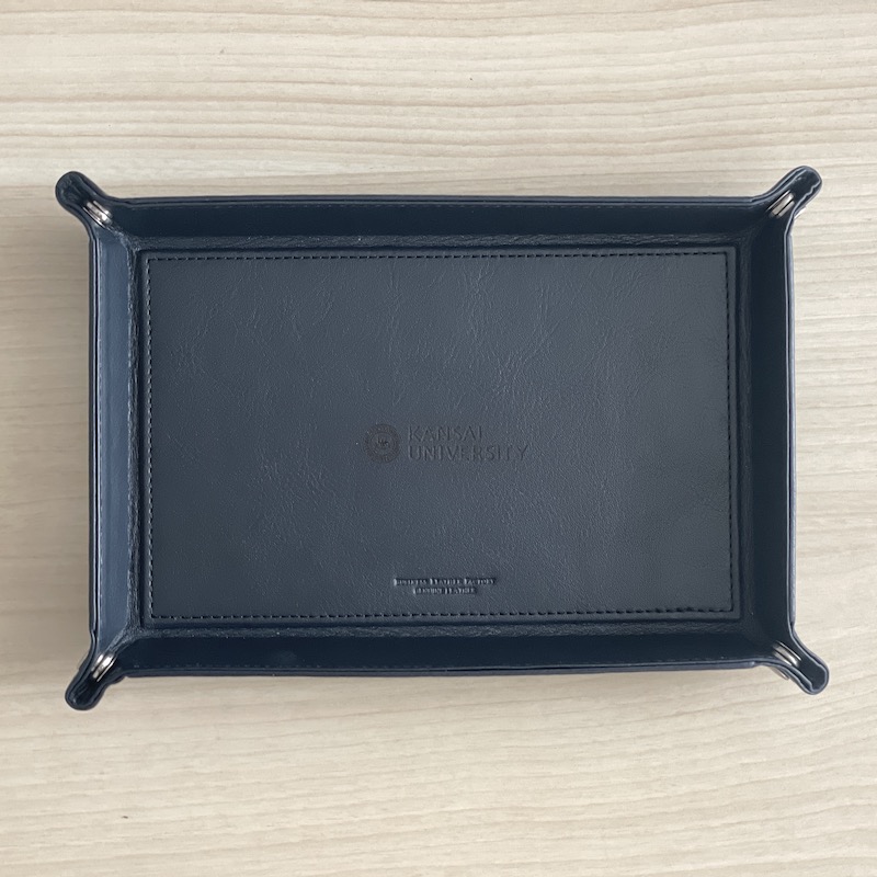 革製品を取り扱うブランド「ビジネスレザーファクトリー」のレザートレーです。中央には関西大学のロゴをさりげなくレーザー刻印しました。