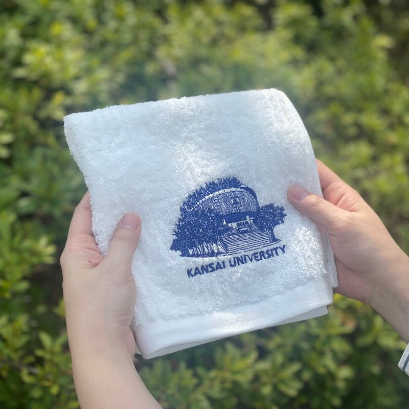 吸水性抜群「ホットマンの1秒タオル」に、関西大学凜風館を刺繍でデザインしました。