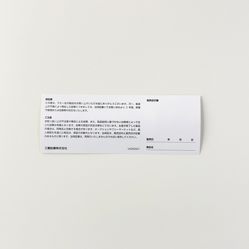 Lamy社の製品につきまして、万一、製造上の不備により発生した故障は、製品へ付属した保証書にてお買い求めより2年間、無償で修理や交換等の対応をいたします。