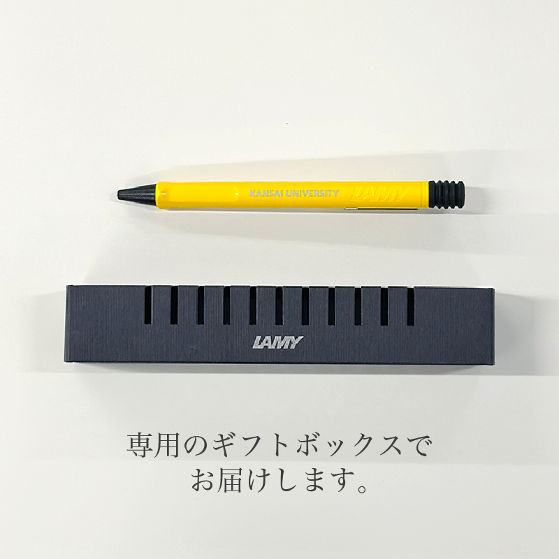 『LAMY safari JETSTREAM INSIDE』は、LAMYの専用ボックスに入れてお届けします。見た目も美しく、ギフトにも最適。卒業祝いや入学祝い、関大ファンの方への贈り物にもおすすめです。