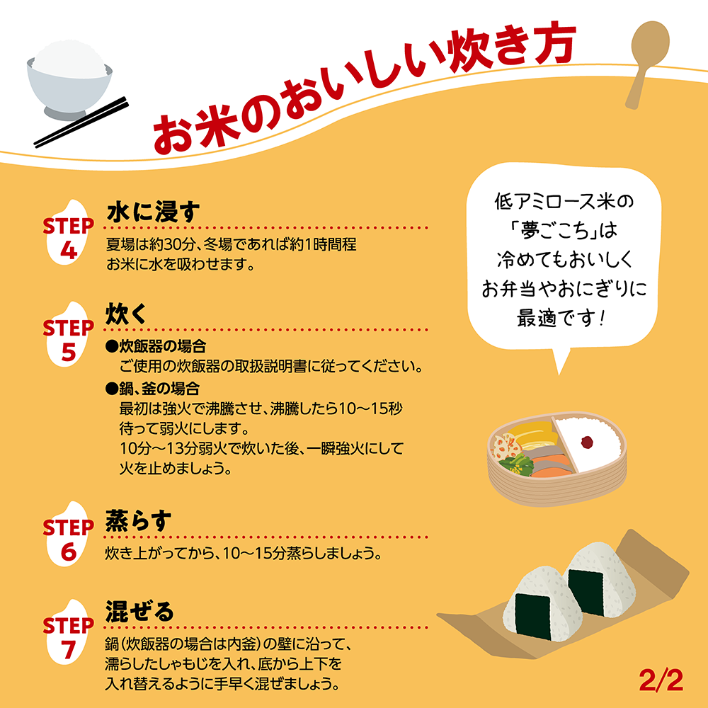 「夢ごこち」という名前は、「食べると夢心地になるほどおいしいお米」という意味から名づけられました。粘りと柔らかさを持つモチモチとした食感のお米で、アミロース含有量がコシヒカリよりも少ない低アミロース米になります。冷めても固くなりにくくお弁当やおにぎりに最適です。